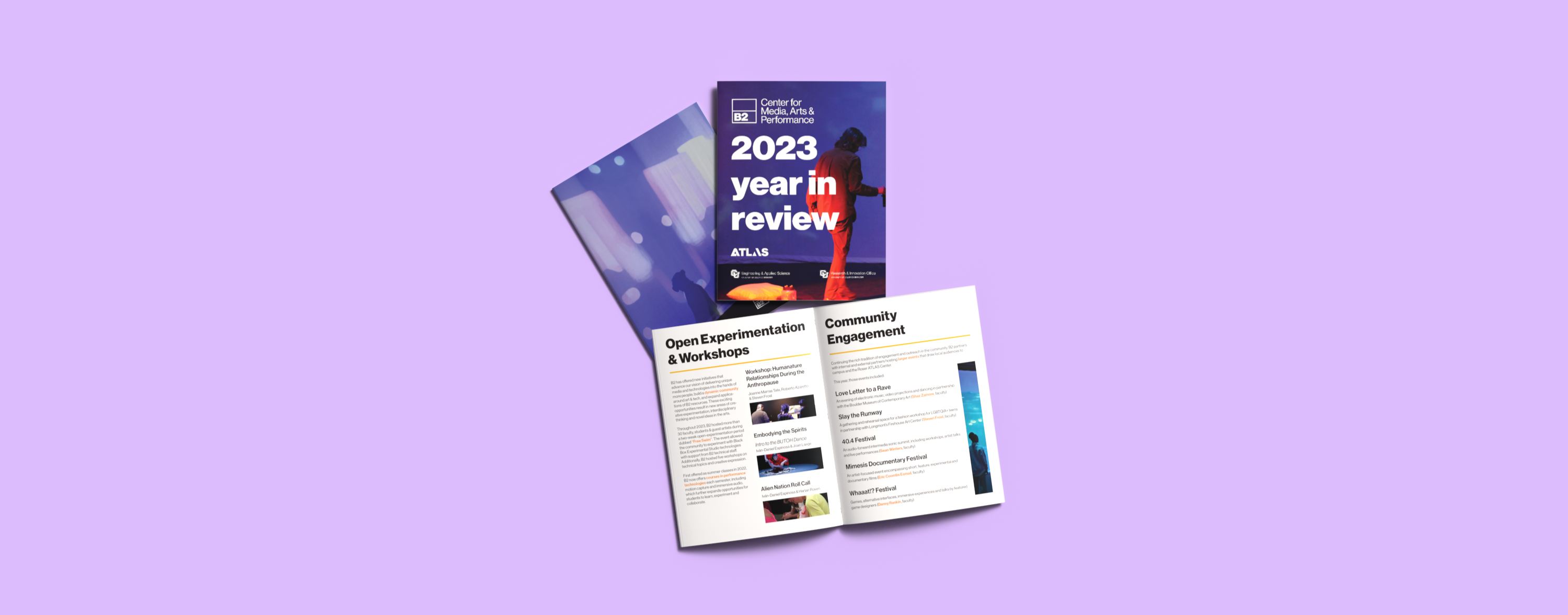 For this book, I followed the brand guidelines of both ATLAS and the B2. I focused on clean layouts with image forward designs. Utilizing photography captured from B2 performances throughout the year, I presented the creative vibrancy of B2's impact.