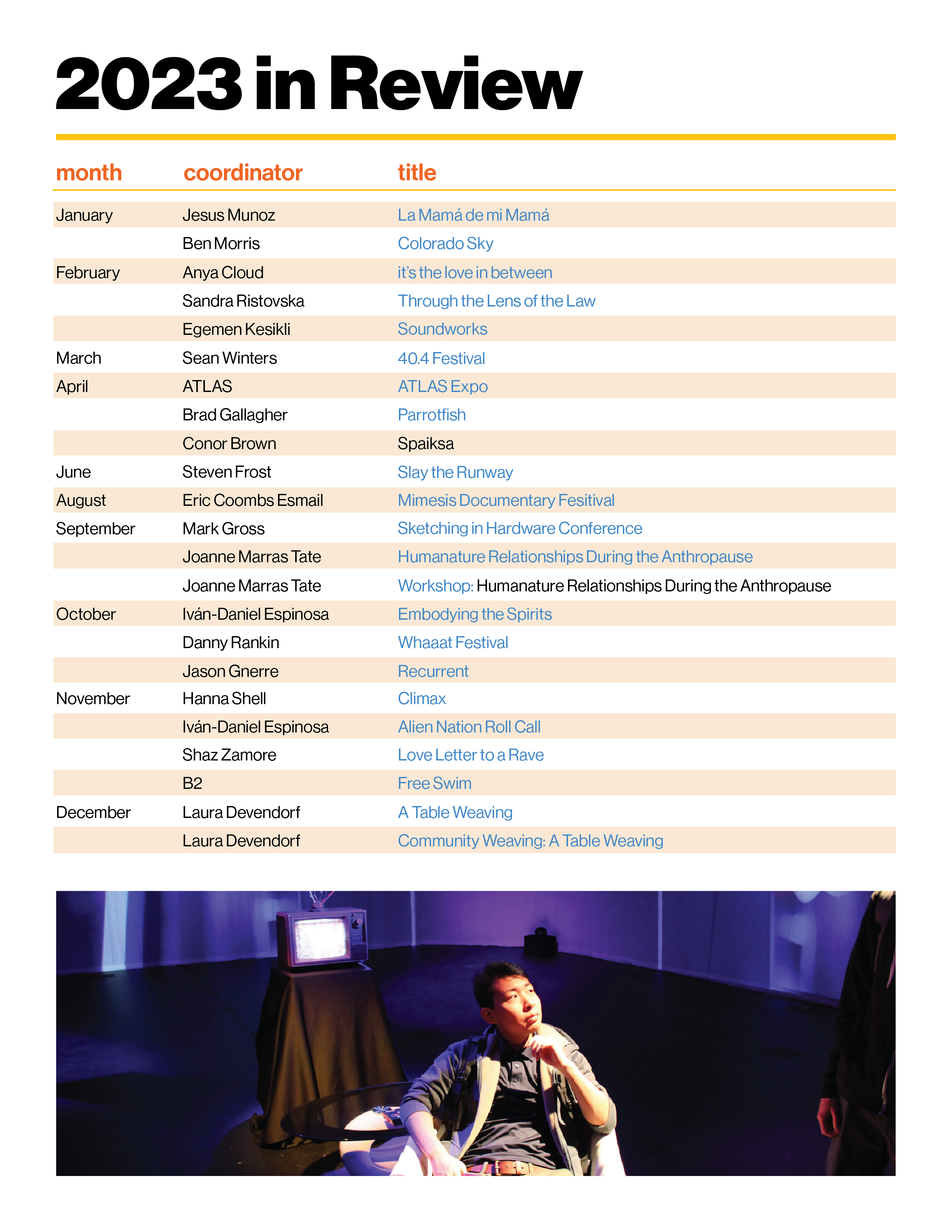 The book consisted of 12 pages, including front and back. It featured an overview of what took place in the B2 that year; performances, residencies, classes, workshops and community events. Investors were also shown the B2's budget for the year.